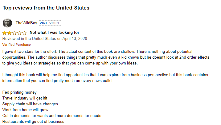 저자의 전문분야에서의 내공을 감히 내가 폄하할 생각은 없다. 하지만, 책의 내용은 표지에서 저자를 치켜세워주는 광고문구들이 낯뜨거울 정도로 부실한 것이 사실이라고 생각한다. 번역서이기에 혹시 지나친 의역으로 말미암아 벌어지는 '제목 사기'가 아닌가 싶어서 원서 제목을 찾아보니 "The Future After COVID"- 군더더기 없이 깔끔한 직역 제목이었다. 그렇다면 나의 독서 내공이 일천하여 책의 심오한 어떤 면면을 이해하지 못해서 그런가 싶어서 미국 아마존의 리뷰를 몇 개 찾아보니 내가 헛짚은 것은 아니라는 확신이 들었다. 샘플로 하나를 제시하자면 아래와 같다.