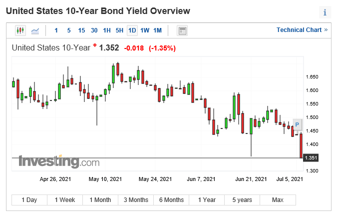 - 지난 3월 말에 1.80% 레벨 부근까지 상승하며 글로벌 금융시장 전반의 변동성을 키웠던 美 10년 국채금리가 간밤에 1.40%를 하향 돌파하며 현재 1.35% 레벨까지 하락함.