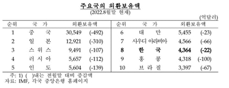- 한편, 지난 8월 말 기준 한국의 외환보유액 규모는 세계 8위에 올랐음.