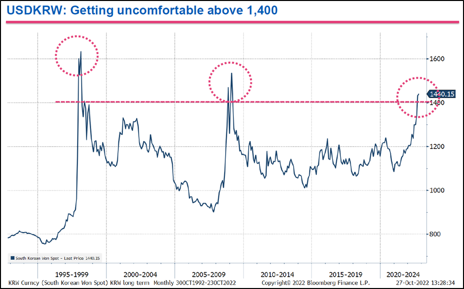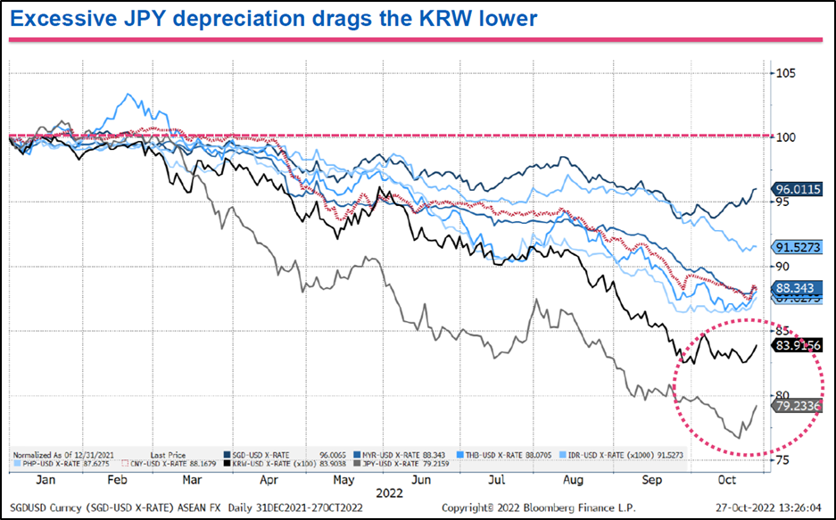 - KRW의 약세는 주요 아시아 통화 중 엔화 다음 두번째이며, 엔화의 급격한 약세가 원화의 가치를 끌어내리는 데에 일조했다고 은행은 판단함.