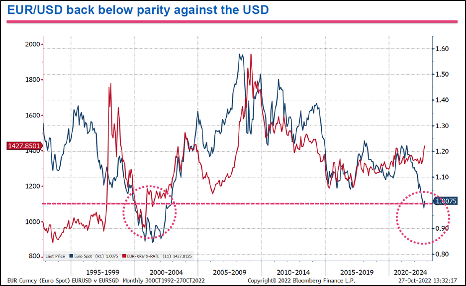 - EUR의 약세는 기본적으로 USD와의 금리차와 우크라이나 전쟁에 따른 경기 악화에 기인함.