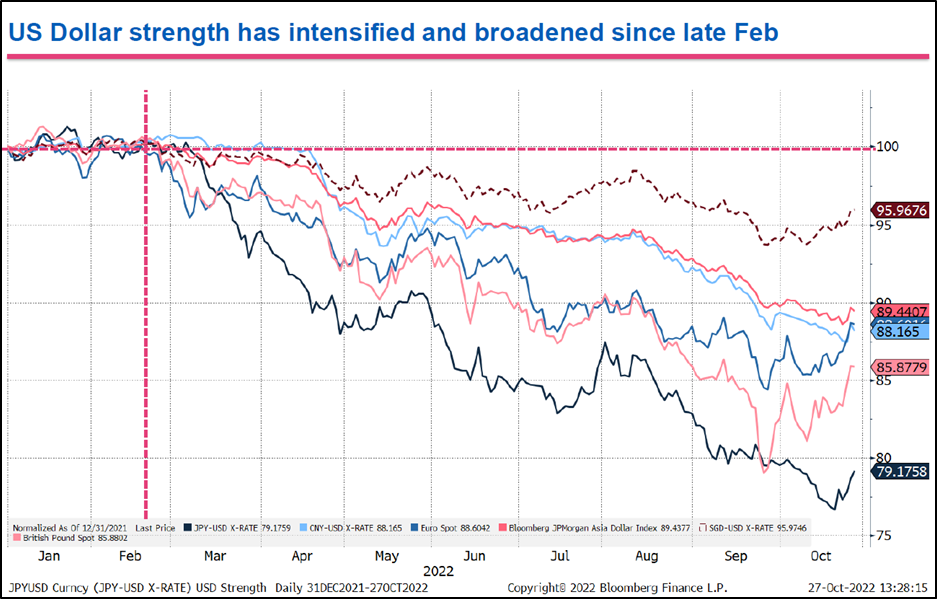- 달러화는 ‘22년 2월 이후 다른 통화 대비 강세가 심화되었으며, 이는 공격적인 금리인상에 기인한 것.
