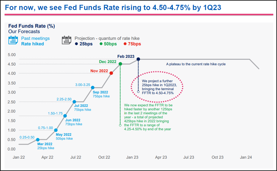 - UOB는 ‘23년 초에 美 기준금리가 고점을 찍을 것으로 전망함.(terminal rate : 4.50%~4.75%)