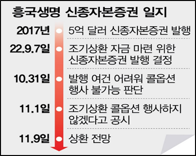 - 당초 흥국생명은 이를 차환 발행할 예정이었지만, 치솟는 금리에 발행 시장 상황이 악화하자 이를 포기하고 콜옵션을 이행하지 않기로 했음.