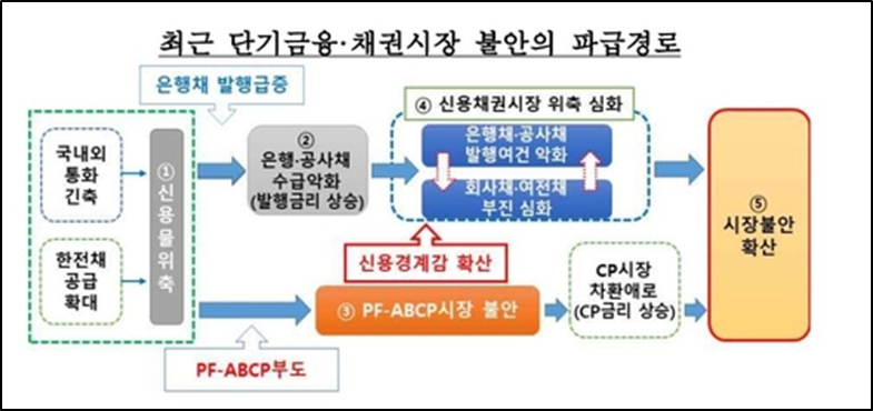 - 한국은행이 기업어음(CP) 시장에서 높은 신용경계감이 지속되고 있다고 평가했음. 또 원활히 작동한 환매조건부채권(RP) 시장이 단기금융시장 불안의 완충 역할을 했으나 향후 리스크가 확대될 경우 불안이 전이될 소지가 있다고 우려했음.