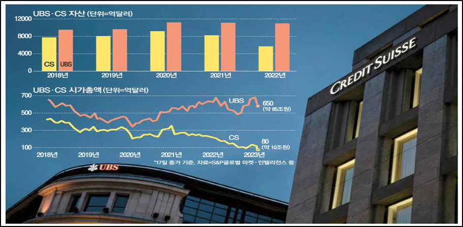 - 스위스 최대 은행 UBS가 결국 위기에 빠진 크레디트스위스(CS)를 인수했다. 인수가는 30억 스위스프랑(약 32.3억달러, 한화 약 4.2조원)으로 정해졌음. 19일(현지시간) 스위스 중앙은행인 스위스 국립은행(SNB)은 긴급 기자회견을 열고 스위스 최대 은행 UBS와 CS의 합병을 공식화했음.